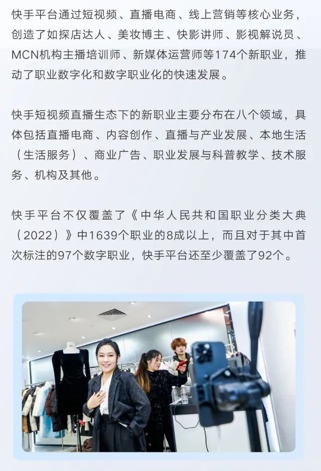 另外,快手平臺通過短視頻、直播電商、線上營銷等核心業務,創造了如探店達人、美妝博主、快影講師、影視解說員、MCN機構主播培訓師、新媒體運營師等174個新職業,推動了職業數字化和數字職業化的快速發展。