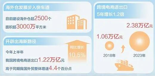 如今,分散在全球各地的海外倉(cāng)連點(diǎn)成線、織線成網(wǎng),跨越山海開(kāi)辟出海新路徑。海關(guān)總署發(fā)布的最新數(shù)據(jù)顯示,今年上半年,我國(guó)跨境電商進(jìn)出口1.22萬(wàn)億元,同比增長(zhǎng)10.5%,高于同期我國(guó)外貿(mào)整體增速4.4個(gè)百分點(diǎn)。從2018年的1.06萬(wàn)億元,到2023年的2.38萬(wàn)億元,5年間,我國(guó)跨境電商進(jìn)出口增長(zhǎng)了1.2倍。