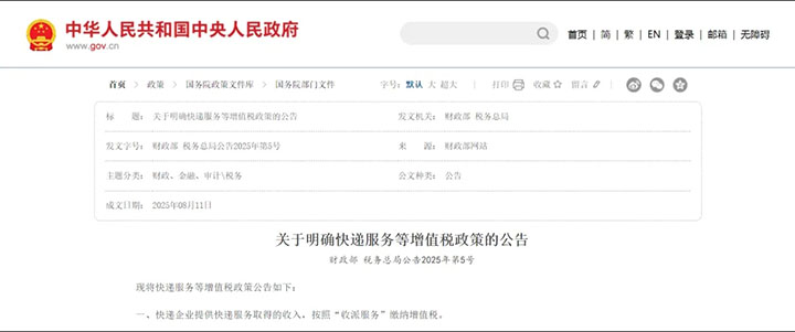 8月12日,財政部、國家稅務總局公布《關于明確快遞服務等增值稅政策的公告》,公告明確,快遞企業提供快遞服務取得的收入,按照“收派服務”繳納增值稅。